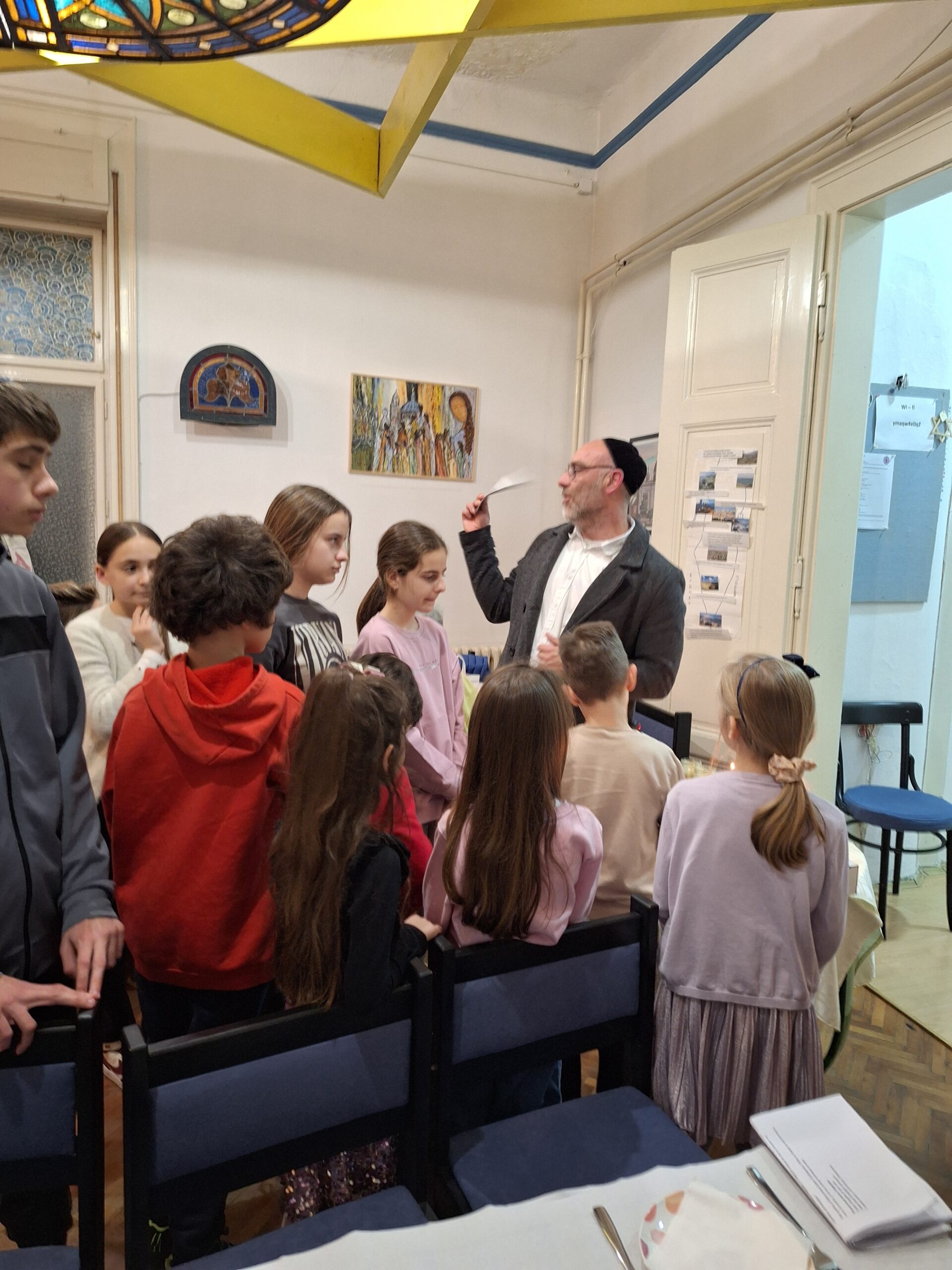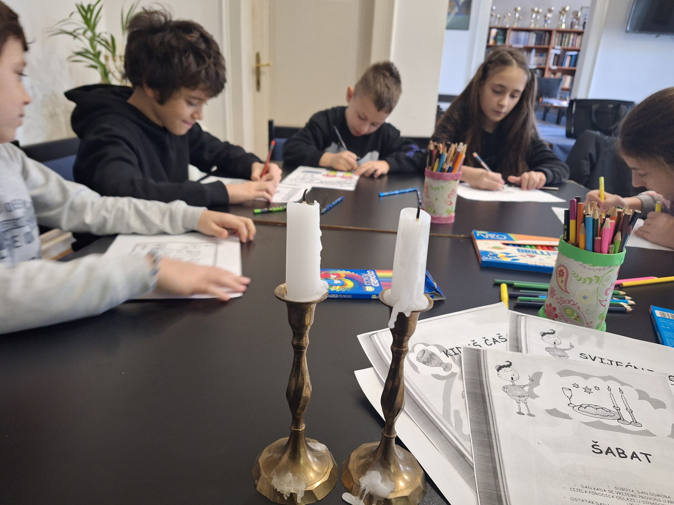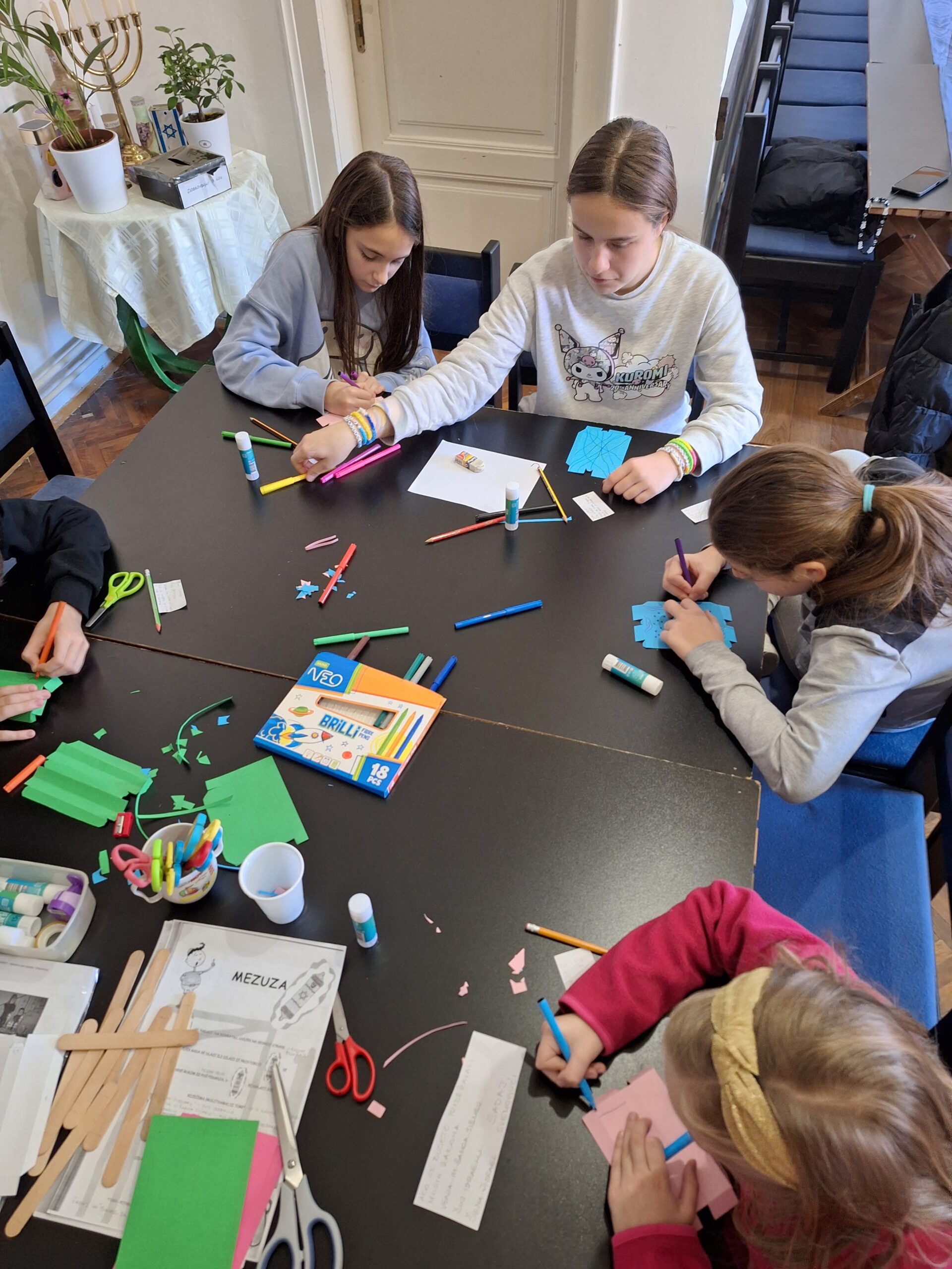 Poslednjih par radionica posvetili smo Šabatu i simbolima judaizma. Na jednoj od njih kratko predavanje o sinagogi i “zaposlenima” u istoj, održao je Nikola Pucarević, dok su deca pomno slušala i davala svoja zapažanja i mišljenja. Simbole koje smo ovog puta pominjali i malo im se više posvetili su mezuza i menora.