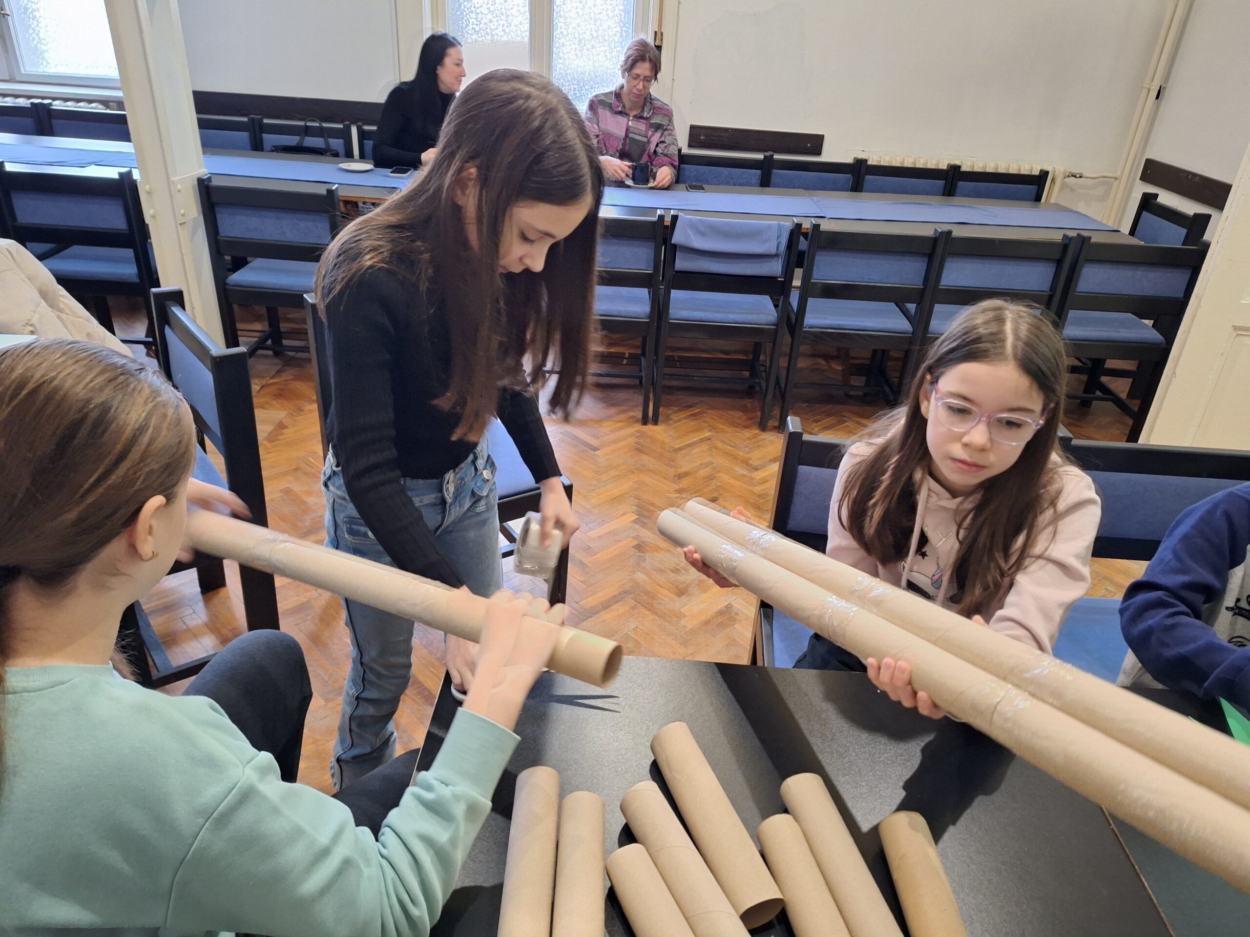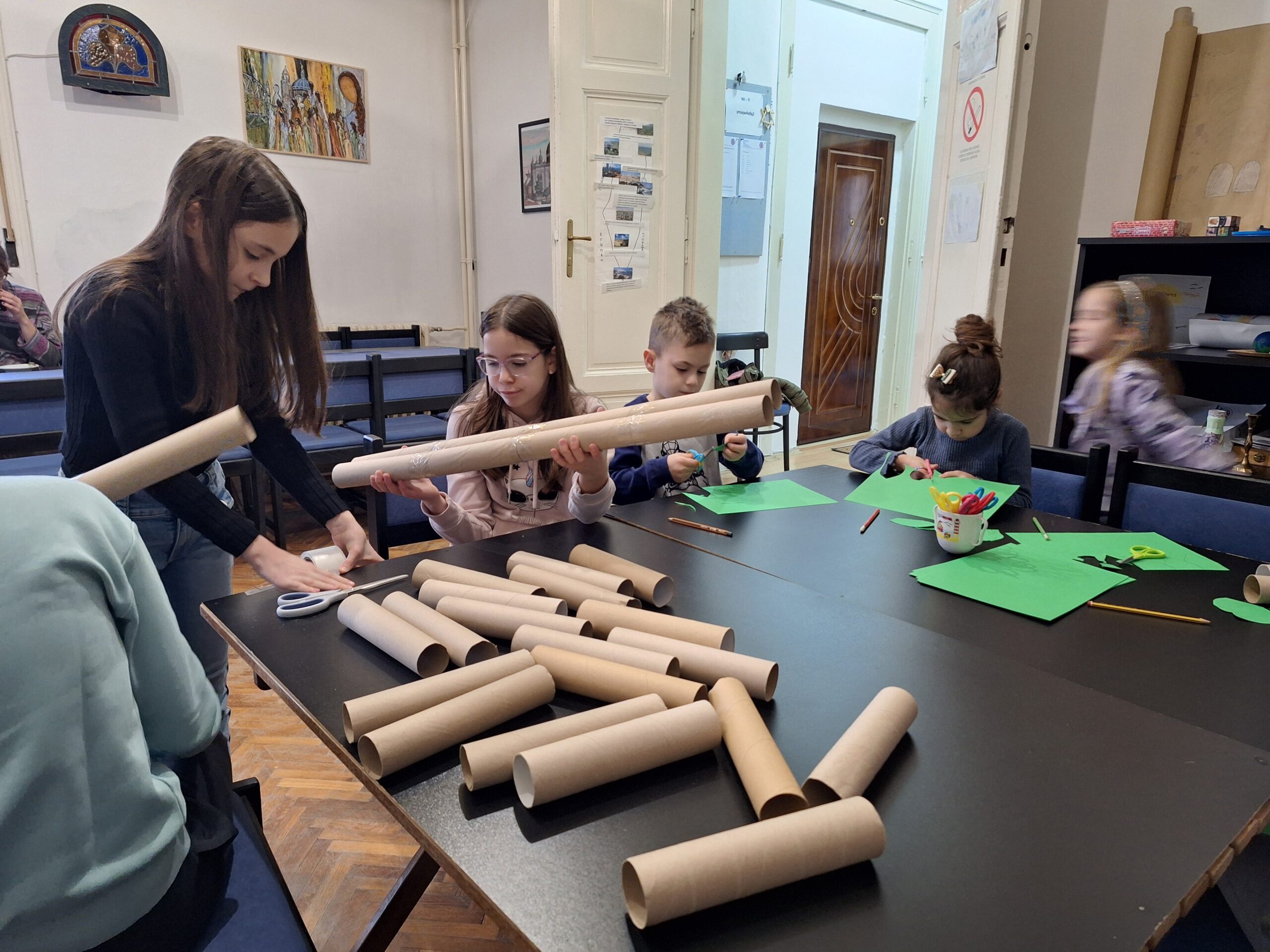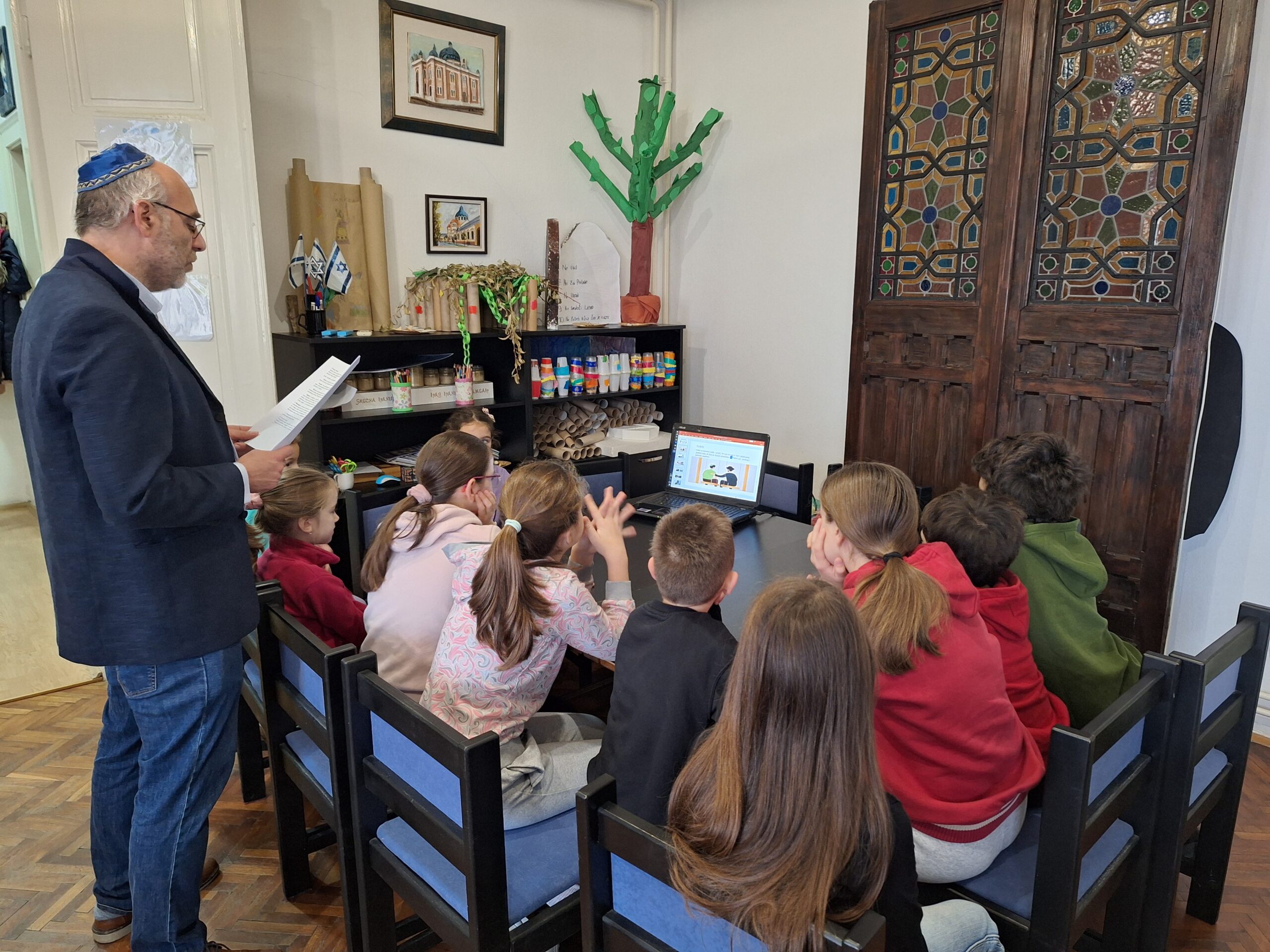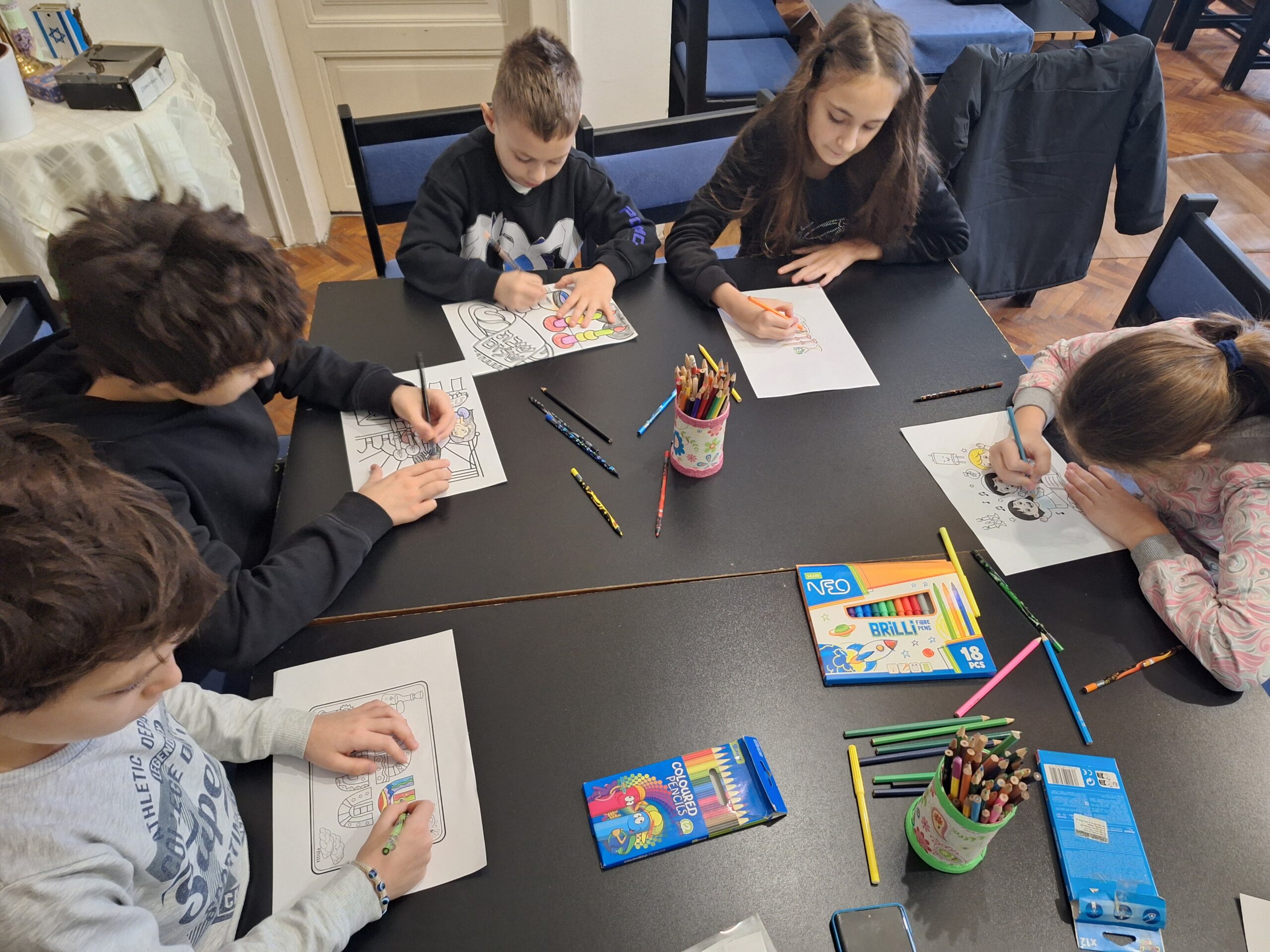 Poslednjih par radionica posvetili smo Šabatu i simbolima judaizma. Na jednoj od njih kratko predavanje o sinagogi i “zaposlenima” u istoj, održao je Nikola Pucarević, dok su deca pomno slušala i davala svoja zapažanja i mišljenja. Simbole koje smo ovog puta pominjali i malo im se više posvetili su mezuza i menora.